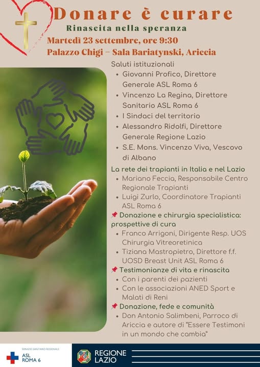 23 SETTEMBRE ASL ROMA 6 PALAZZO GHIGI ARICCIA CONVEGNO DONARE E’ CURARE RINASCITA NELLA SPERANZA